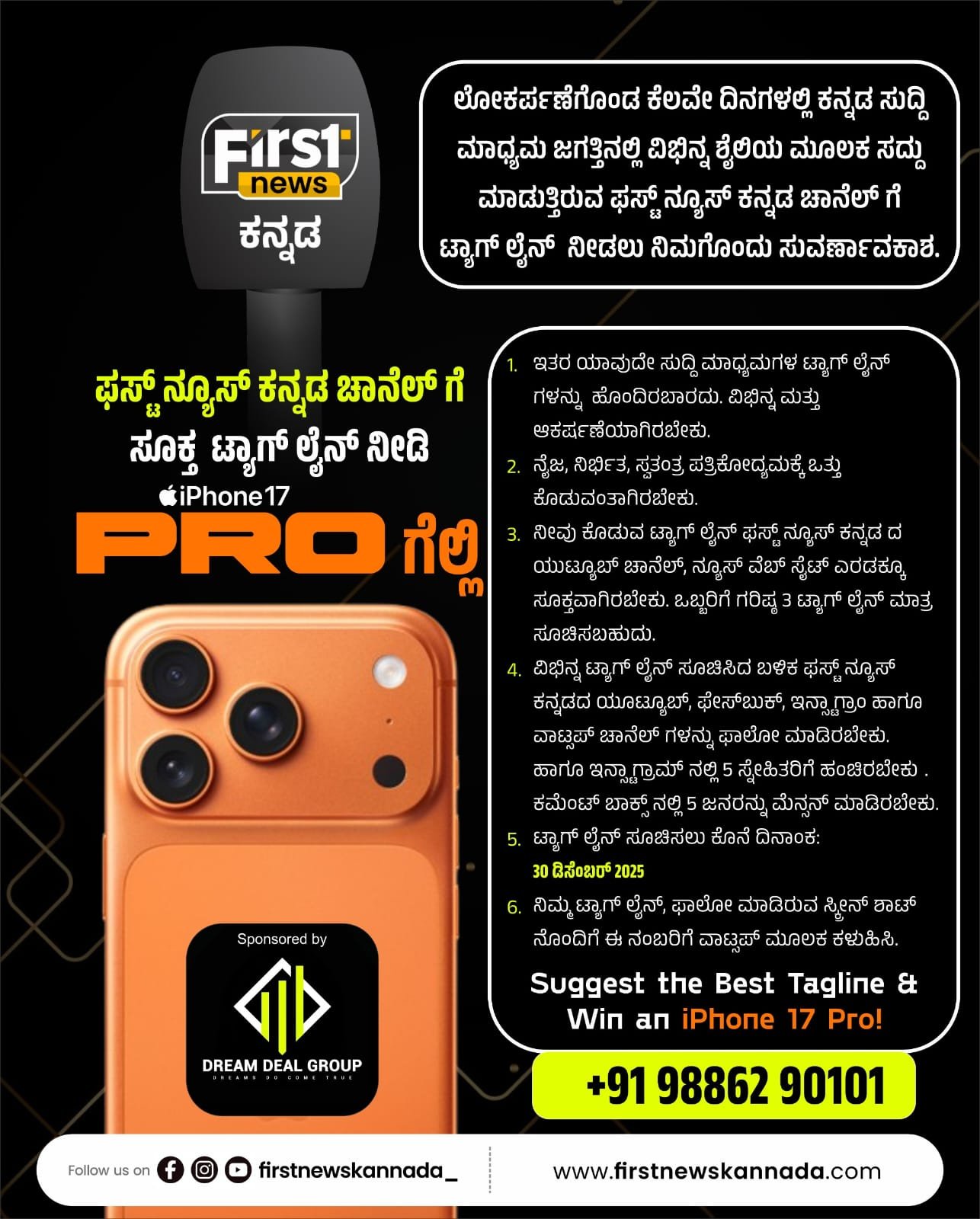 First News ಕನ್ನಡ ಚಾನೆಲ್ಗೆ ಸೂಕ್ತ ಟ್ಯಾಗ್ ಲೈನ್ ನೀಡಿ iPhone 17 Pro ಗೆಲ್ಲಿ..! December 1, 2025 No Comments Read More »